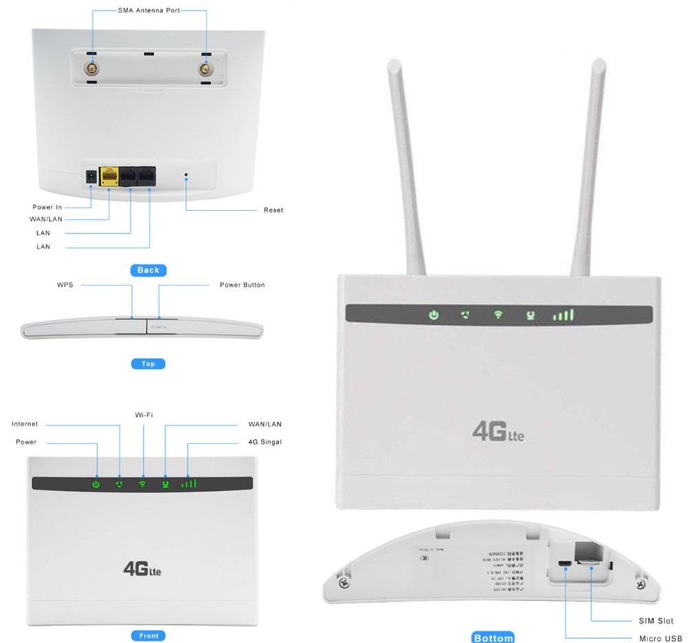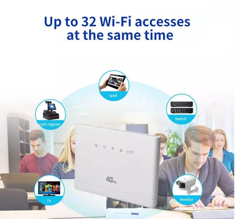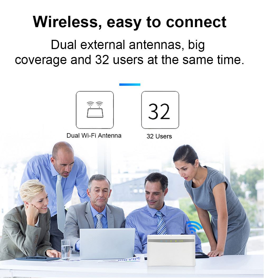 Tämä on erittäin edistyksellinen LTE-sisätilojen CPE-reititin. Se on suunniteltu vastaamaan integroituihin data- ja Wi-Fi-käyttötarpeisiin asuin-, yritys- ja yrityskäyttäjille. (voi muodostaa yhteyden SMA-liittimen ulkoisiin antenneihin!) 150M suuri nopeus, LTE FDD: DL/ UL 150M / 50 Mbps (Cat 4). Siirrä 4G Wi-Fi-verkkoon, Ei tarvitse laajakaistayhteyttä, aseta SIM-kortti , plug and play. WiFi Kattaa koko huoneiston ja talon, nauttia nopeasta internetistä kaikkialla. Helppo kytkeä, kaksi ulkoista antennia, suuri peitto ja 32 käyttäjää samanaikaisesti.