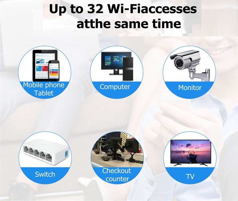 Jopa 32 WiFi-yhteyttä samanaikaisesti. Kun 4G-reititin lähettää WiFi-yhteyttä, se voi yhdistää verkkokaapeleilla samanaikaisesti tietokoneita, näyttöjä, kytkimiä, kassakoneita, televisioita ja muita laitteita.